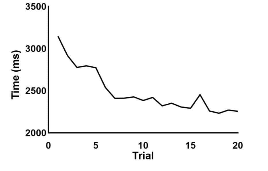 The graph below is some real data from some motor learning research I am doing (motor learning = learning a task involving moving). It’s a simple task involving navigating a mouse around a screen as fast as you can. The graph below shows the average time taken (less is better; vertical axis) by 150 participants and the number of attempts they made (along the bottom). The people who have done the task have improved over the 20 attempts (not just on average; every individual got better). You might say they have displayed some learning.