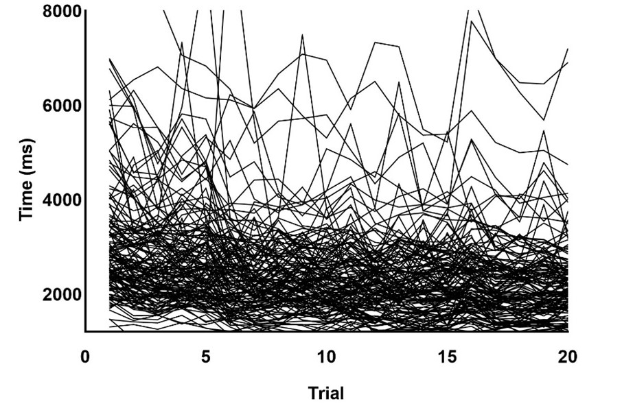 Now look at the next graph below. This is exactly the same data but showing everyone’s individual attempts at the task rather than the average. Every line in this shows someone getting better overall (they are faster at the end than at the start), but they go up and down all over the place on the way! This is how the learning process always looks: messy!